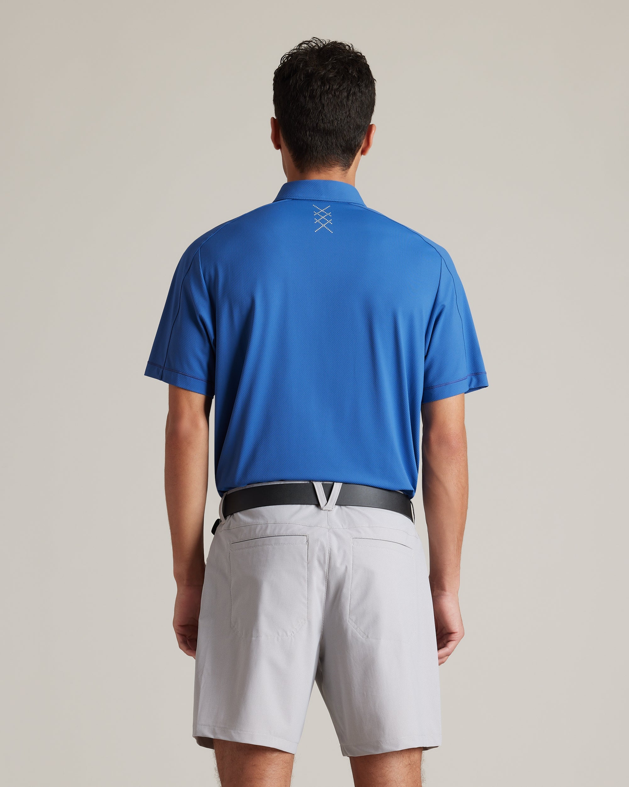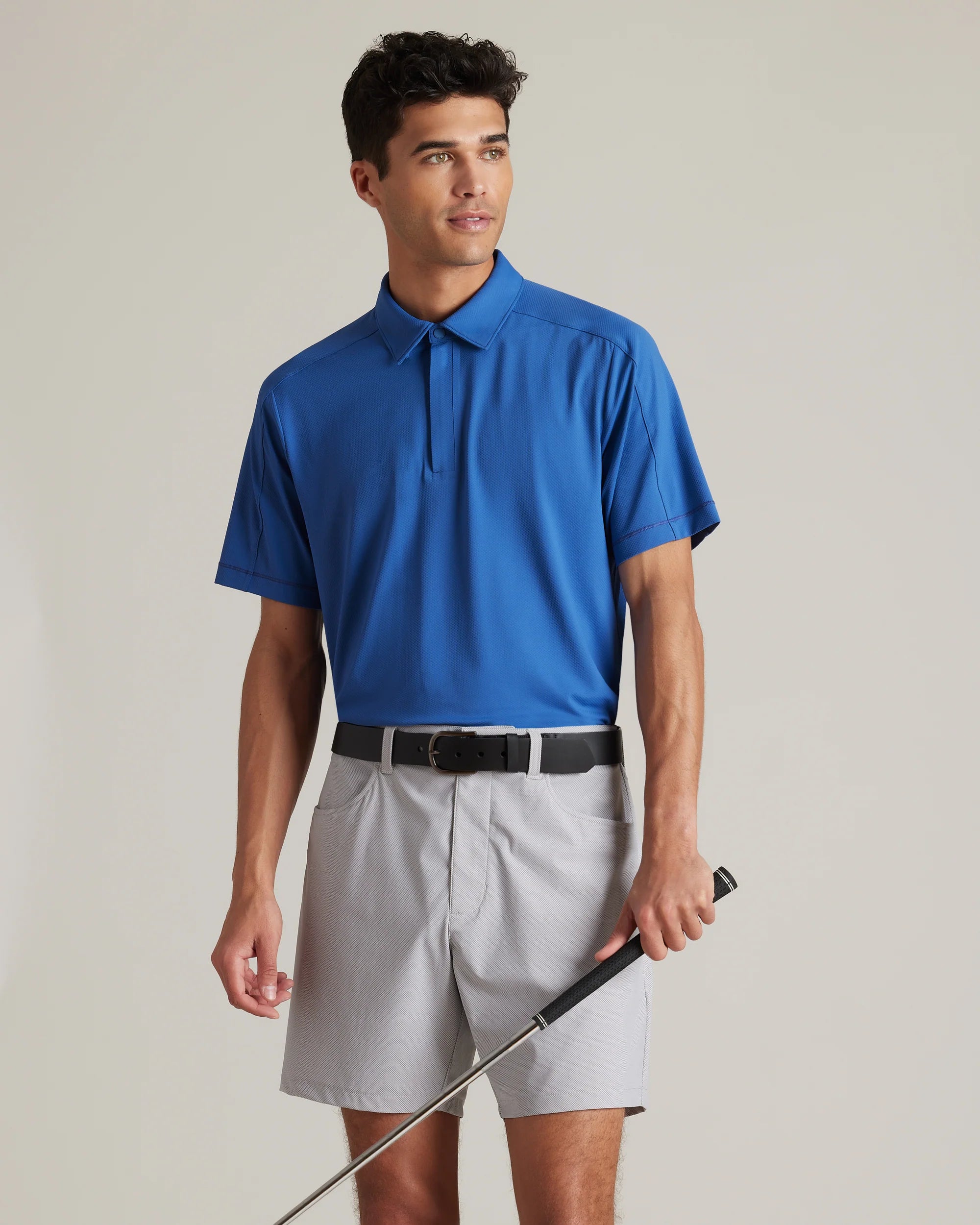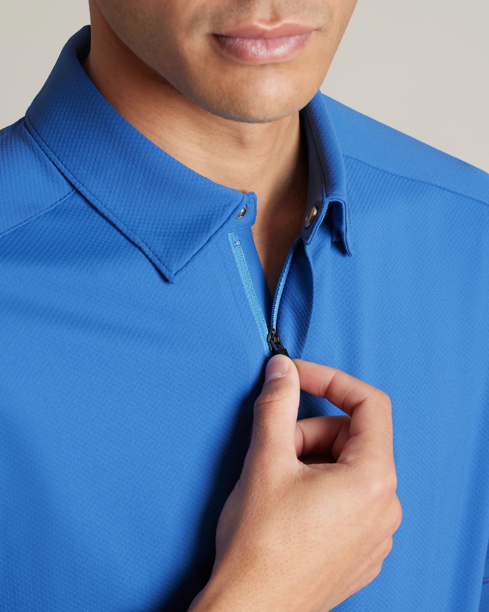 Introducing the Momentum Tech Golf Polo—a refined fusion of luxury and performance, designed for the ultimate day on the green. Crafted from an Italian-milled, textured all-way stretch fabric that combines Nylon and Elastane, this polo delivers a premium feel while actively wicking sweat and keeping you cool with Glacier Cooling Technology. UPF 50+ sun protection and welded seams reduce bulk and chafing, ensuring you stay comfortable from the first tee to the final putt. Every detail—from the zippered front placket with snap closure to the raglan shoulder seams and side slits—has been engineered for a full range of motion and lasting shape. With integrated collar stays and advanced odor-control technology, this polo is as functional as it is stylish.