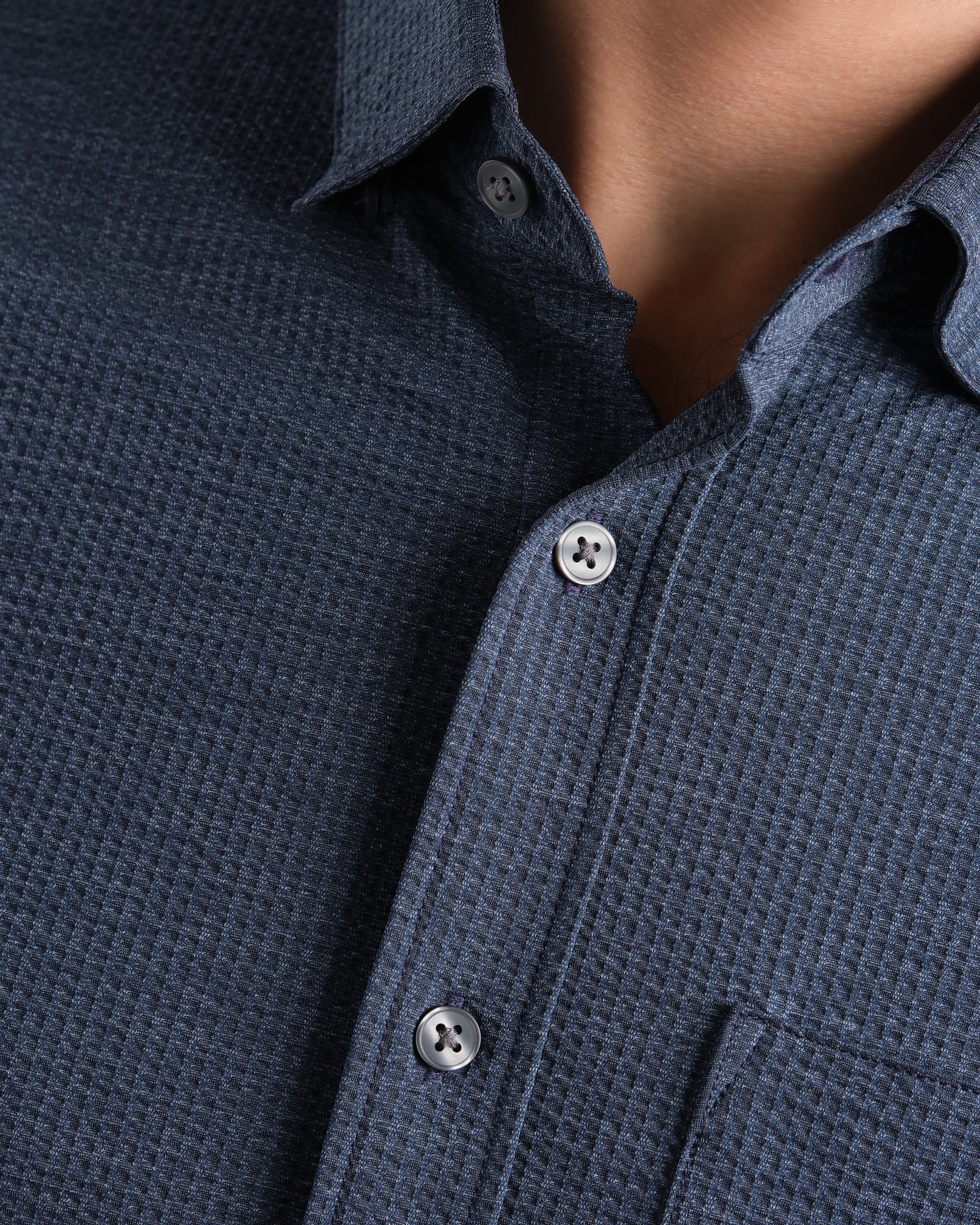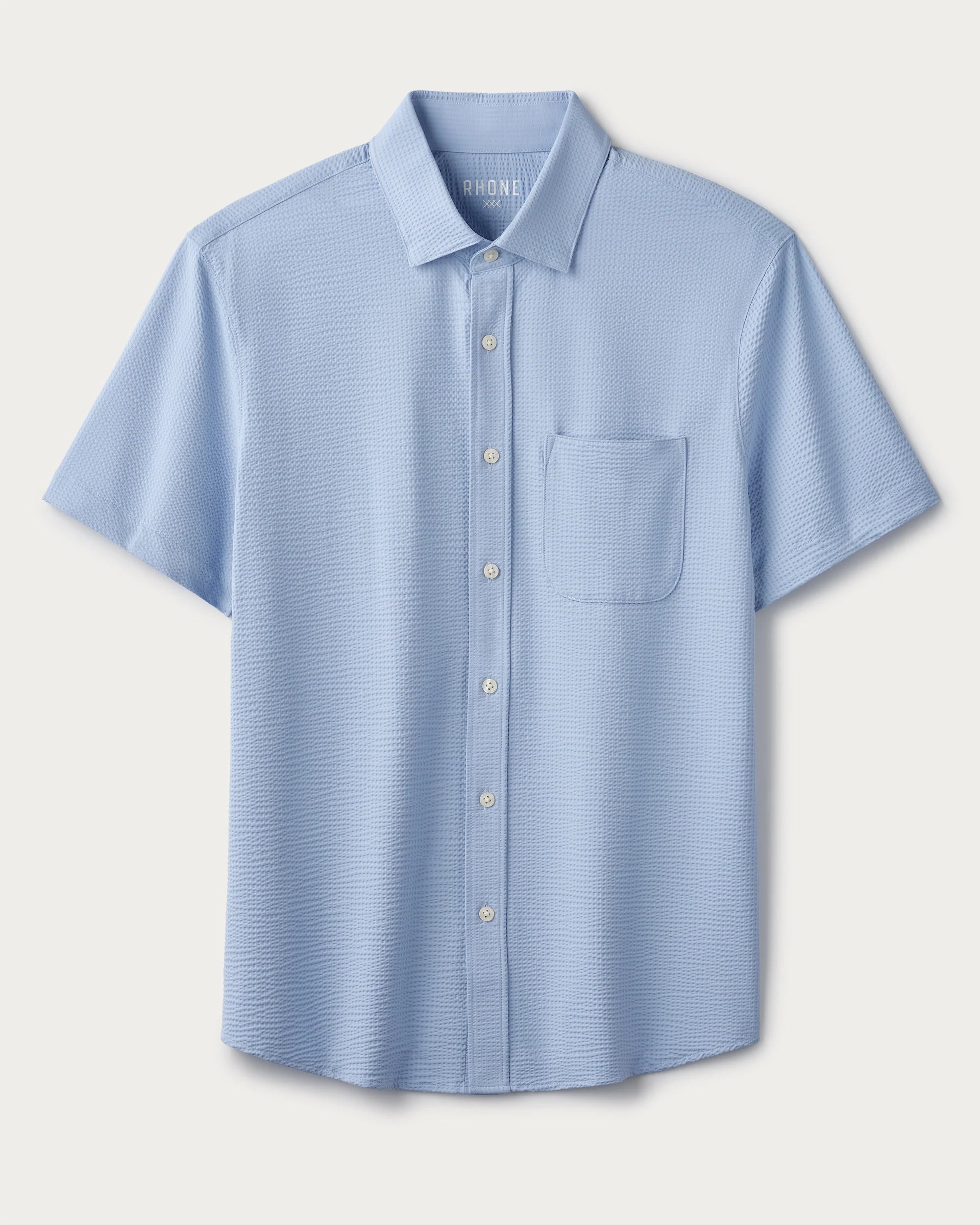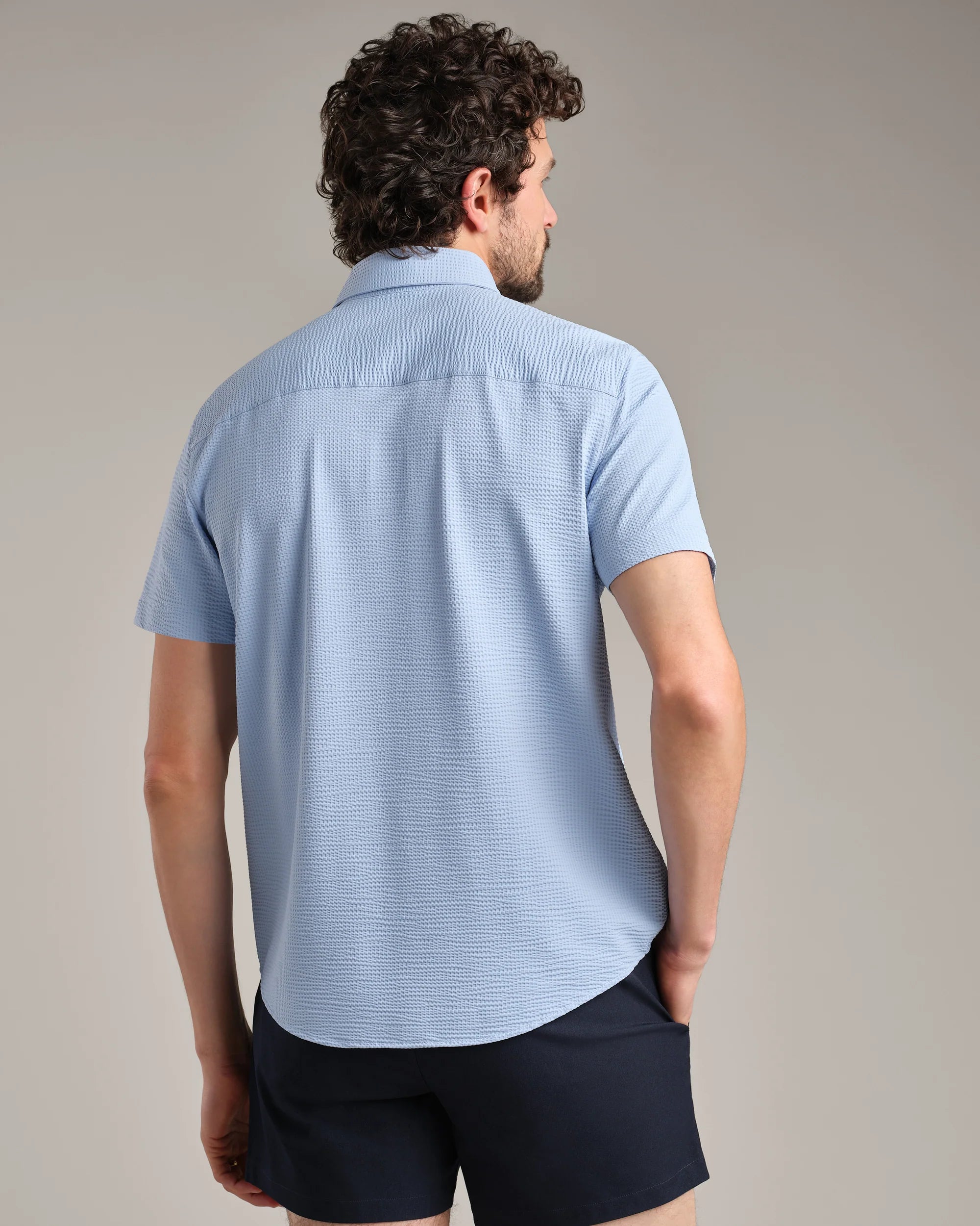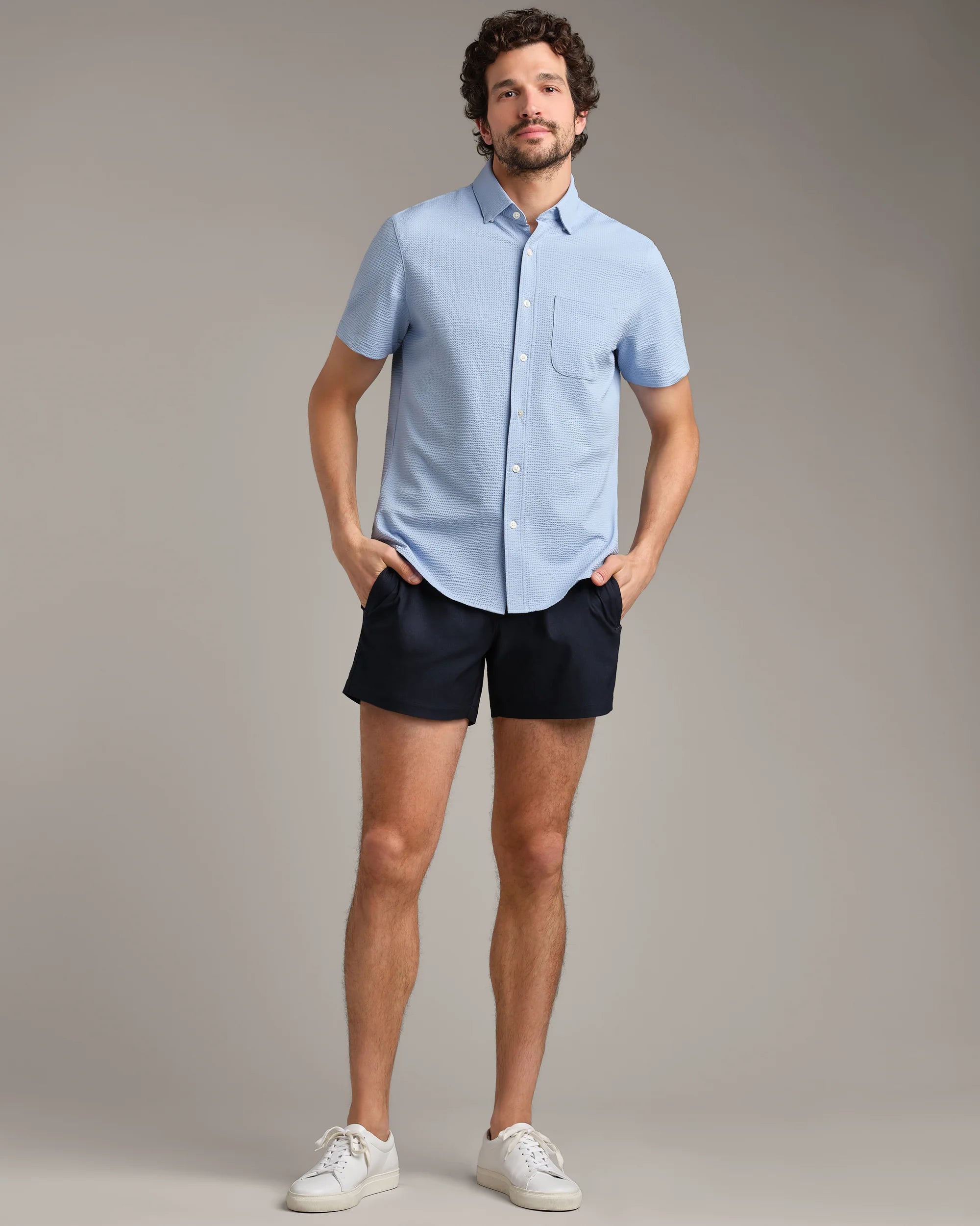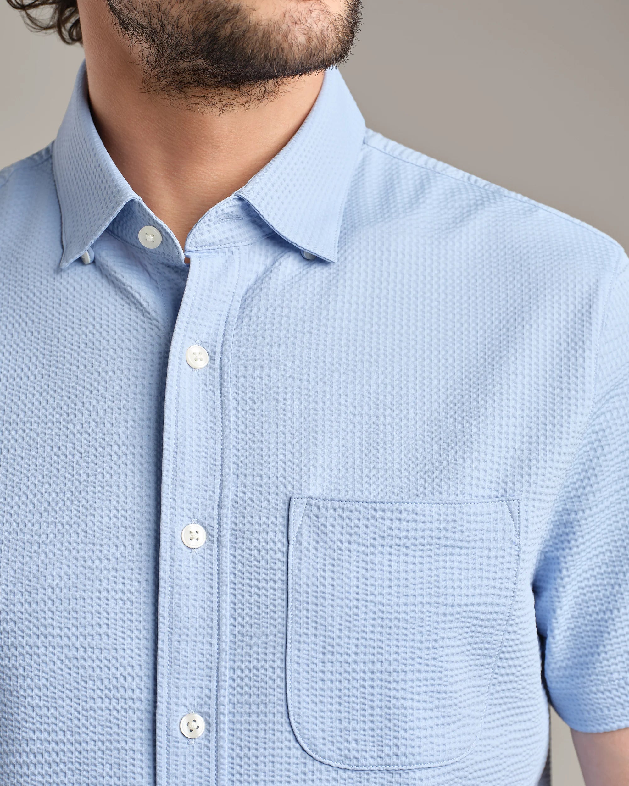 Escape to the Italian countryside in the Commuter® Seersucker Short Sleeve Button Down. Crafted from a fine Italian seersucker knit fabric that combines polyamide and elastane for a perfect balance of durability and stretch, this piece evokes a relaxed summer vibe. The classic button-front styling and hidden button collar create a refined silhouette, while a subtle chest pocket adds practical charm. A true breath of fresh air for your summer wardrobe.